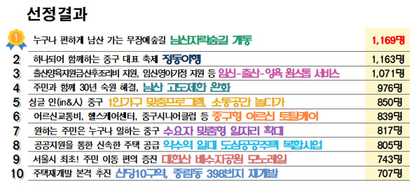 1인가구 지원 맞춤프로그램(850표), 어르신교통비지급, 헬스케어센터, 중구시니어클럽 등 중구 어르신 토탈케어(839명), 원하는 주민은 누구나 일하는 중구 수요자 맞춤형 일자리 확대(817명) 역시 높은 점수를 받았다.