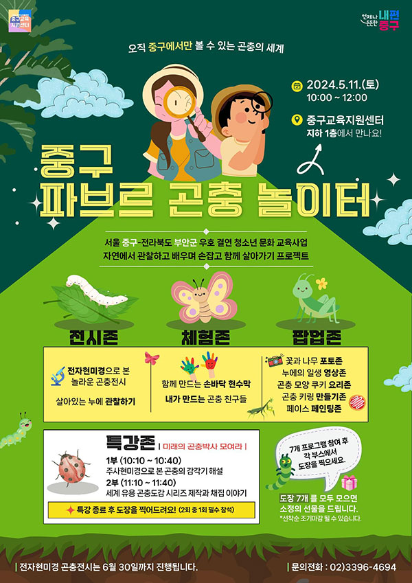 <파브르 곤충 놀이터> 7개 프로그램에 참여하여 도장을 찍어오면 소정의 선물도 제공한다. 궁금한 사항은 중구 교육지원센터(02-3396-4694)로 전화하여 문의하면 된다.